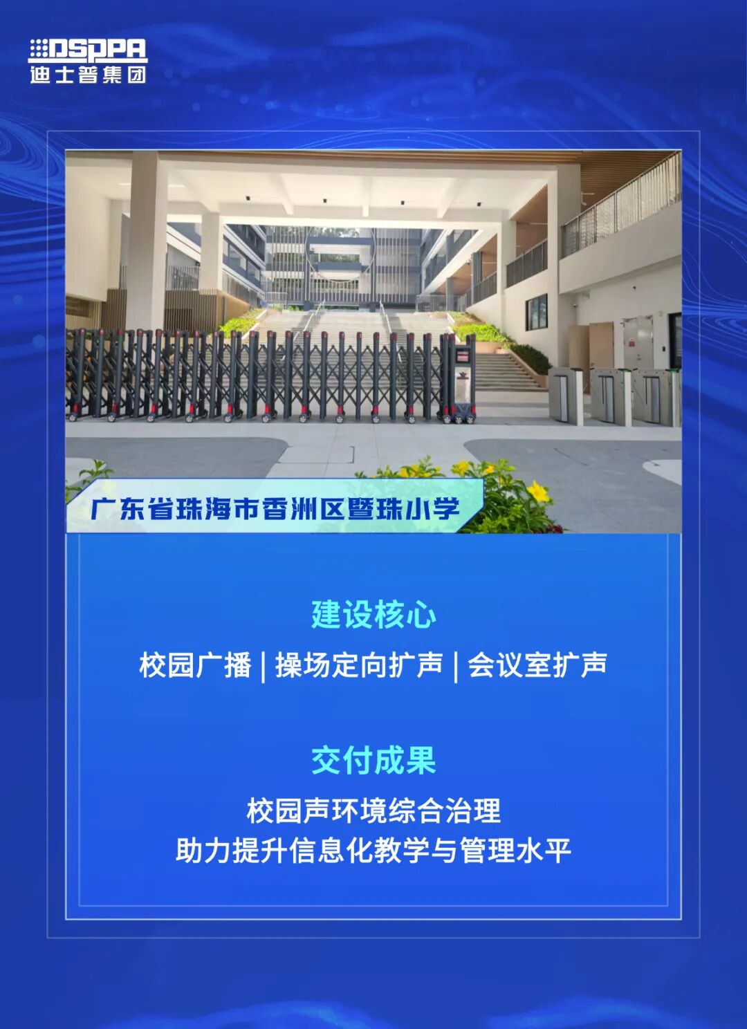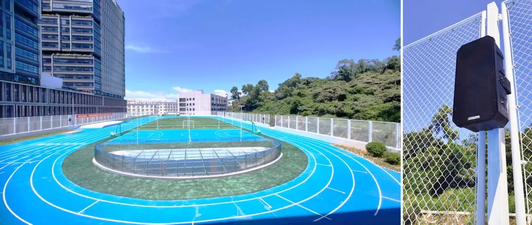 为了从源头解决噪音扰民问题,迪士普技术团队将多只定向音箱按照科学布点部署在操场外圈区域。通过精准声向调节,广播扩声精准定向覆盖在操场区域,从根源上有效解决扰民问题。